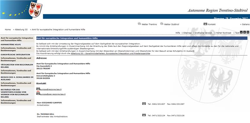 Die Webeseite des Regonalamtes für europäische Integration und humanitäre Hilfe.