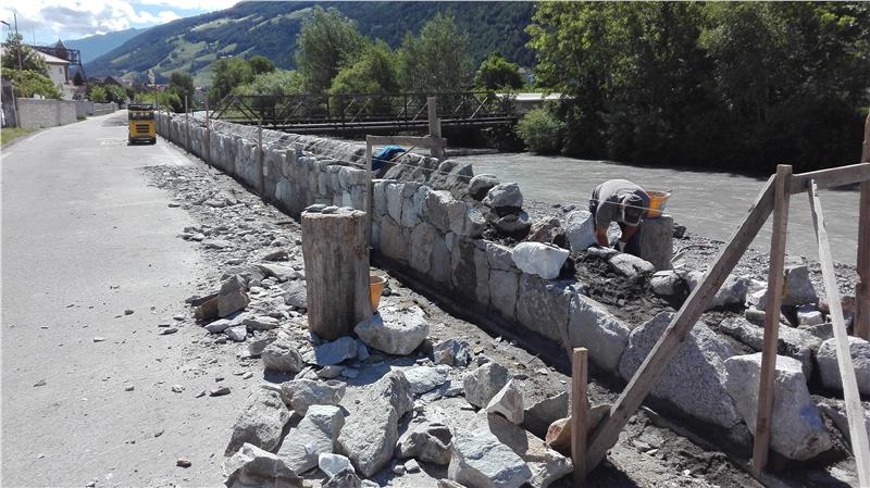 Im Zuge des mittlerweile vierten Bauloses wird in der Ortschaft Laas das orografisch linke Etschufer gegen Erosion gesichert, indem ein Fundament aus Zyklopensteinen und Beton errichtet wird. Auf einer Länge von rund 140 Metern wird zudem eine Brüstungsmauer gebaut. "Um die Mauer dem historischen Ortskern anzupassen, wird sie luftseitig so gestaltet, dass im Mauerwerk kein Beton sichtbar ist", erklärt Bauleiter Julius Staffler.