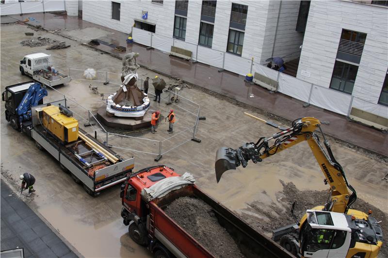 Die Arbeiten zur Verlegung des Laurin-Brunnens vom Magnago-Platz in Bozen in den danebenliegenden Bahnhofspark haben begonnen und dauern den Tag.
