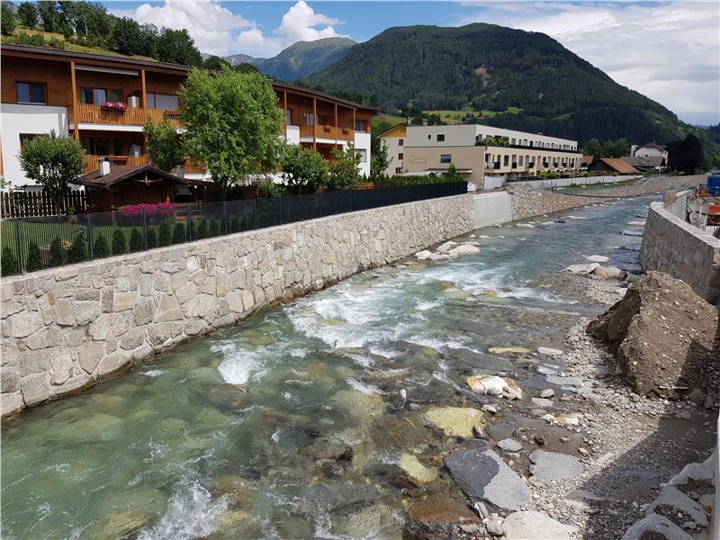 Dafür wurde das Flussbett tiefer gelegt, die alten Ufermauern wurden abgebrochen und neu errichtet, um die geforderte Breite zu erreichen. Eine besondere Herausforderung in diesem Baulos waren laut Projektant und Bauleiter Philipp Walder nicht nur die geringen Abstände zu Privatgebäuden, sondern vor allem der Abbruch der alten Flainser Brücke. Dafür mussten die Infrastrukturen neu verlegt und beispielsweise auch das Verkehrskonzept der Busse durch das Amt für Mobilität überarbeitet werden, da diese Verbindung über den Eisack momentan nicht mehr vorhanden ist. Wegen der Lage mitten im Siedlungsbereich wurde auch besonders auf ein optisch ansprechendes Erscheinungsbild geachtet, das mit einer Steinmauer in Handarbeit sehr gelungen ist. Neben der Funktion der Hochwassersicherheit wurde auch das Bachbett ökologisch gestaltet, die Flusssohle wurde mit Zyklopensteinen abwechslungsreich gestaltet.