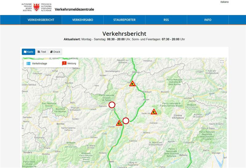 An 365 Tagen im Jahr gibt die Verkehrsmeldezentrale aktuelle Auskünfte über die allgemeine Verkehrslage zu Verkehrsbehinderungen, Staus und Unfällen in Südtirol sowie über Baustellen, Passstraßen und Radarkontrollen, ab heute (7. August) über die neue Webseite. Auskünfte gibt es künftig auch über die Schließung der Radwege wegen Instandhaltungsarbeiten an den Dämmen, Pflanzenschnitt, Mäharbeiten usw.