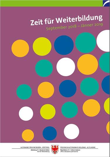 In der Broschüre "Zeit für Weiterbildung" sammelt das Landesamt für Weiterbildung Kurse der Weiterbildungsanbieter in Südtirol. Sie listet ein umfangreiches Programm an Weiterbildungsveranstaltungen in der Erwachsenenbildung in Südtirol auf, das von beruflicher Qualifikation über Sprachen, Gesundheit, Kreativität, Persönlichkeitsentfaltung, kultureller und sozialer Bildung reicht.