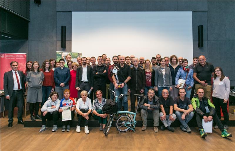 Die Prämierten der jüngsten Ausgabe von "Südtirol radelt" mit den Landesräten Richard Theiner und Waltraud Deeg (Foto: STA/Daniele Torchia)