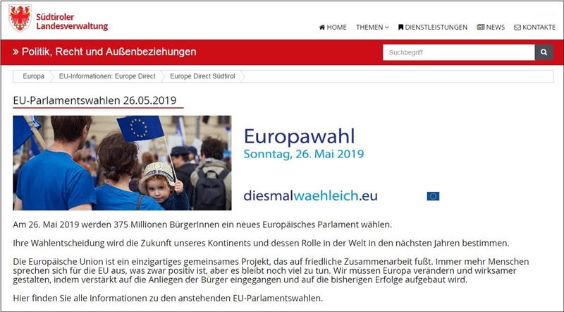 Europe Direct, das offizielle Informationszentrum der EU in Südtirol, informiert auf einer Webseite über die anstehende Wahl des Europäischen Parlaments.