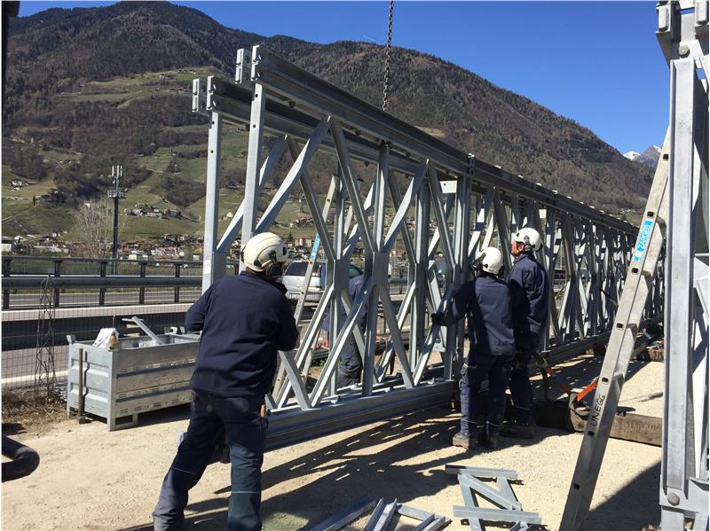Um die Arbeiten auszuführen, wurde mit der Abteilung Straßendienst eine provisorische Brücke mit einer Spannweite von über 40 Metern auf Höhe der Obstgenossenschaft Cafa in Untermais errichtet, sodass die direkte Zufahrt von der MeBo zur Baustelle gewährleistet ist.