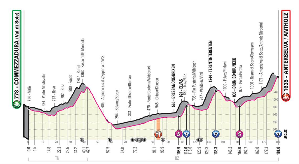 Bei der 17. Etappe von Commezzadura im Val di Sole im Trentino bis nach Antholz überqueren die Giro-Teilnehmer am Mittwoch (29. Mai) den Mendelpass und fahren weiter nach Eppan, wo die Durchfahrt um 13.45 Uhr erfolgen sollte, durch Bozen, Klausen, Brixen, Pfalzen, Bruneck bis nach Antholz. Der Mendelpass wird ab circa 11.30 Uhr gesperrt. Die Unterbrechung der Straßen auf dieser Strecke erfolgt jeweils zwei Stunden vor der Durchfahrt der Truppe.