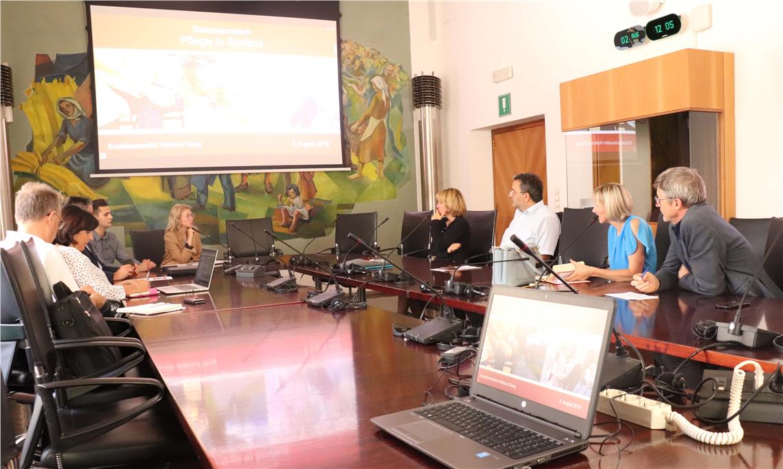 Soziallandesrätin Waltraud Deeg hat heute (2. August) mit einigen Landtagsabgeordneten und Vertretern der Bezirksgemeinschaften und Gemeinden über die Bedeutung und Absicherung der Pflege diskutiert. "Vor Kurzem bin ich mit dem Hauspflegedienst unterwegs gewesen und konnte mir dabei unmittelbar einige Inputs für den anlaufenden Prozess des Landessozialplanes abholen", berichtete die Landesrätin. Zudem habe sie bei mehreren Treffen mit Organisationen und Diensten aus dem Bereich Soziales zahlreiche Anregungen mitgenommen. Wichtig sei es, nah an den Menschen zu bleiben, ihre Bedürfnisse und Wünsche ernst zu nehmen und die bestmöglichen Angebote für Pflegebedürftige, aber auch für Pflegeleistende gut aufzustellen.