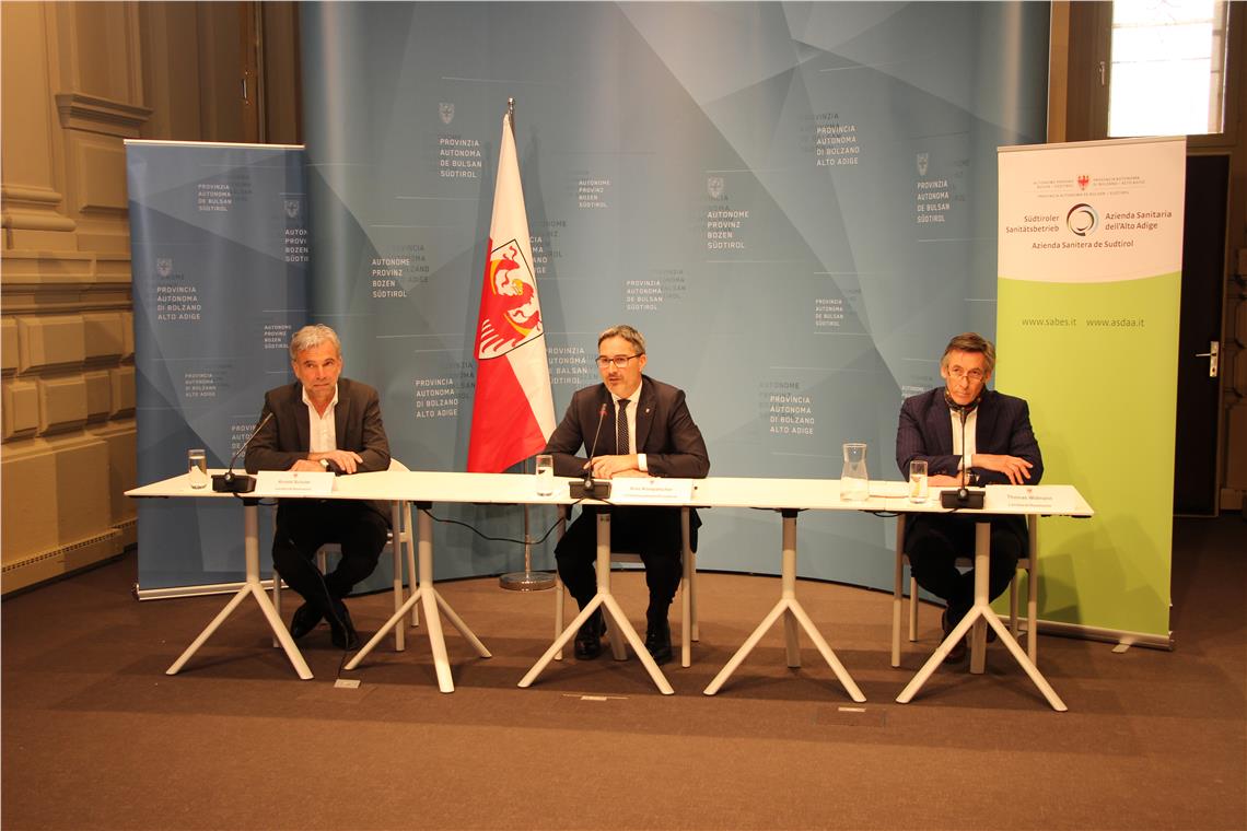 Landeshauptmann Arno Kompatscher, Gesundheitslandesrat Thomas Widmann und Zivilschutzlandesrat Arnold Schuler