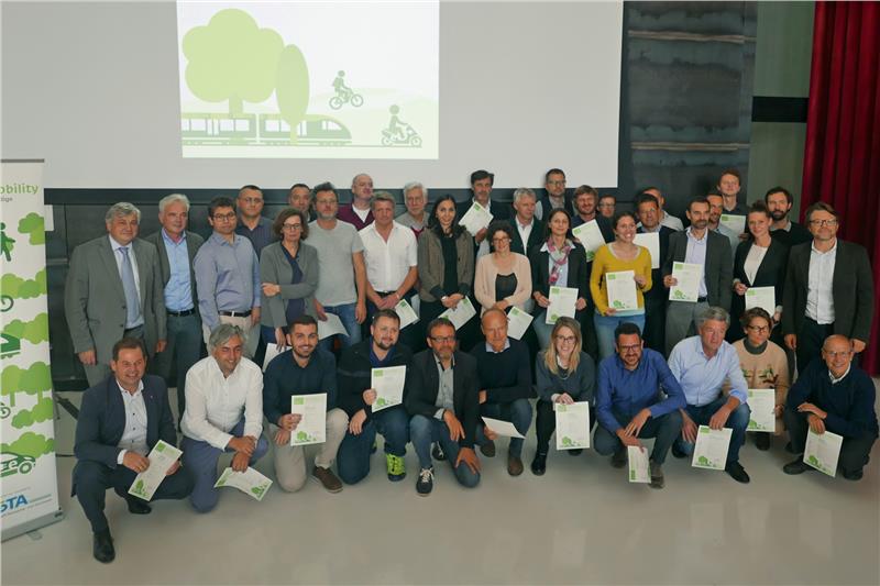 Sechs Monate lang haben sich 40 Verantwortliche aus Politik und Verwaltung sowie Planer von Mobilitätsinfrastrukturen intensiv mit dem Thema der nachhaltigen Mobilität auseinandergesetzt. Beim zweiten Mobilitätslehrgang haben sich die Teilnehmenden mit der Frage beschäftigt, wie sich Verkehr vermeiden lässt und wie der öffentliche Nahverkehr ebenso wie die Radmobilität auf Gemeindeebene gefördert werden können. Auch der Beitrag der Elektromobilität zur Lösung von Verkehrsproblemen wurde erörtert. Ihre Diplome erhielten die frisch gebackenen Mobilitätsexperten nun aus den Händen von Mobilitätslandesrat Florian Mussner.