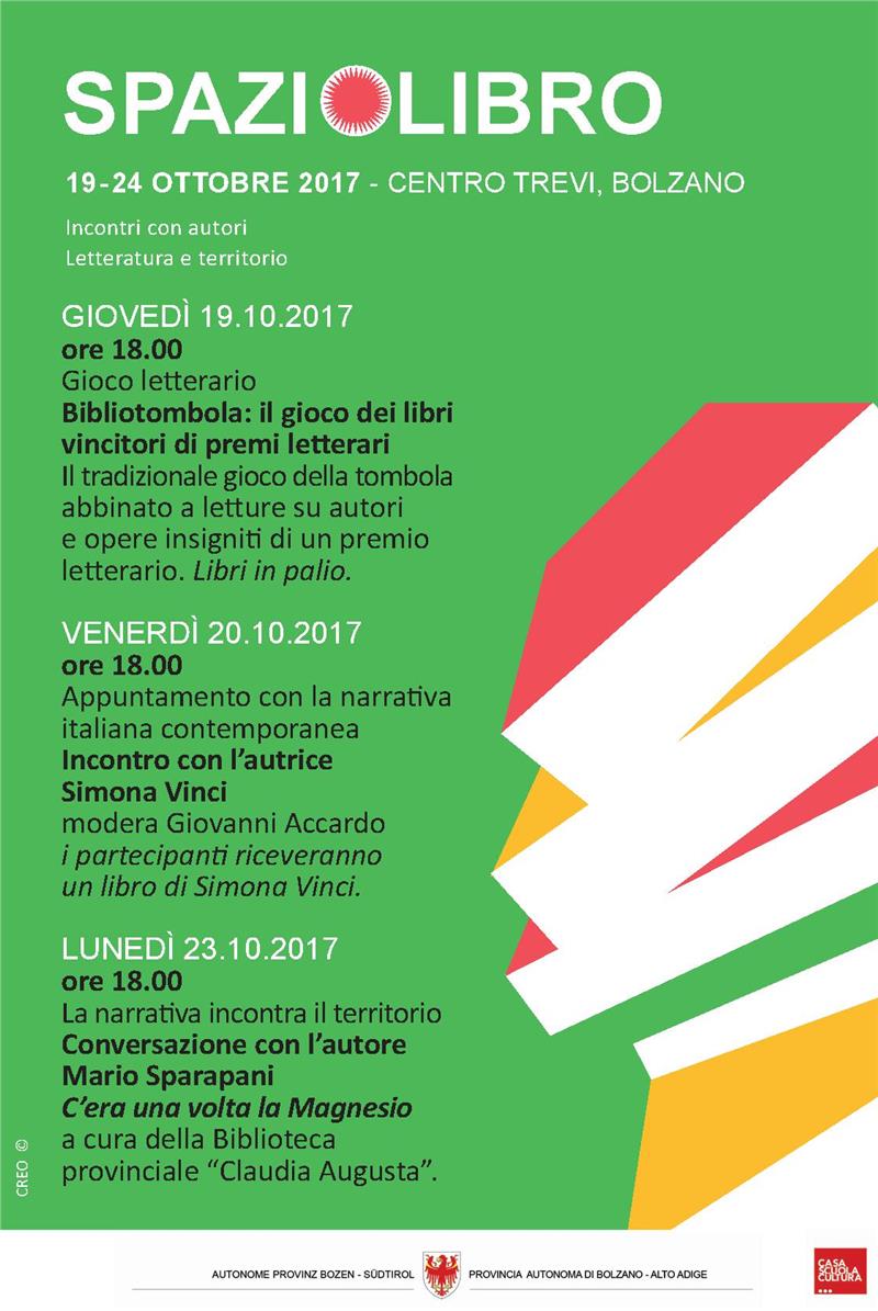 Am 19. Oktober um 18 Uhr steht "Bibliotombola" auf dem Programm, ein literarisches Spiel, das auf dem Tombola-Spiel basiert. Am 20. Oktober um 18 Uhr stellt die Autorin Simona Vinci ihre Werke vor. Am 23. Oktober um 18 Uhr hat die italienische Landesbibliothek Claudia Augusta eine Begegnung mit dem Autor und Herausgeber Mario Sparapani organisiert.