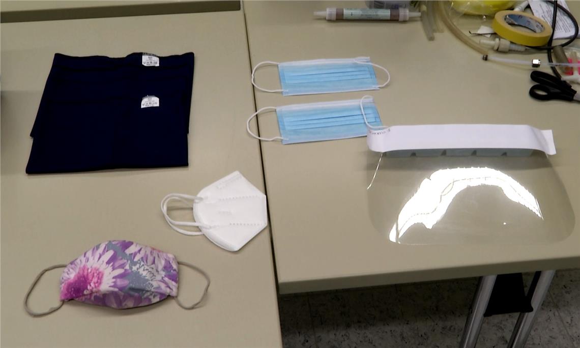 FFP2/KN95-Maske, chirurgische Maske, selbstgenähter Mund-Nasen-Schutz, Gesichtsschutzvisier und Schlauchtuch: Die Untersuchungen wurden mit diesen fünf Typen von Mund-Nasen-Bedeckungen durchgeführt. (Foto: Landesagentur für Umwelt und