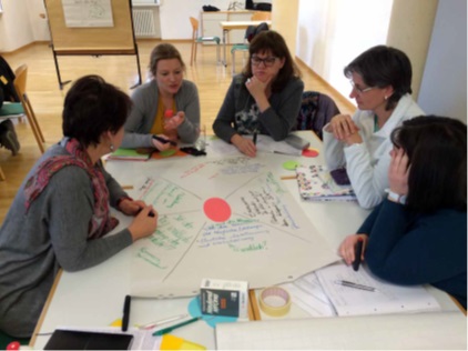 „In einem Modul der Kursfolge haben wir im Methodenatelier neben quantitativen auch qualitative Evaluationsmethoden kennen gelernt und erprobt. Dies hat uns Mut gemacht, an der Schule die üblichen Fragebögen einmal beiseite zu legen. Die Angebote zum fächerübergreifenden Unterricht evaluierten wir anhand einer qualitativen Methode (Placemat). Die beteiligten Lehrpersonen sowie Schülerinnen und Schüler waren mit vollem Engagement dabei.“, so berichtet eine Teilnehmerin bei der Abschlusspräsentation.