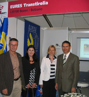 Lo stand di Eures Trans Tirolia fornisce informazioni sui posti di lavoro vacanti e sulle candidature al lavoro oltre i confini regionali, nonchè notizie sulle condizioni di vita e di lavoro nelle regioni aderenti a questa sorta di alleanza per il lavoro.