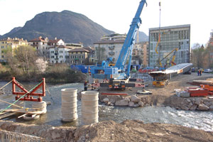 Il primo elemento del ponte in acciaio è giunto a Bolzano questa mattina alle 7.00 sotto scorta di Polizia, scaricato e posizionato sui Prati del Talvera davanti al Museion con un'apposita gru: la sua lunghezza 40 metri, il suo peso 40 tonnellate.