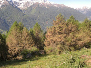 Ciclicamente, ogni otto-dieci anni, i boschi delle Alpi subiscono l'assalto delle larve della tortrice grigia (Zeiraphera diniana), una farfalletta larga appena venti millimetri, che depone le uova sui rami dei larici. "A maggio - sottolineano gli esperti forestali della Val Venosta - le uova si schiudono e le larve si nutrono degli aghi fino all'arrivo dell'estate, quando scendono nel terreno e mutano nelle farfalle adulte. Siccome le larve non mangiano tutti gli aghi, quelli che rimangono si seccano e alcuni rami diventano di colore giallo o marrone". La tortrice grigia è sempre presente sulle Alpi, ma di norma non rappresenta una minaccia per la vegetazione. Periodicamente, però, il numero dei bruchi aumenta a dismisura, e i larici rischiano di soccombere sotto i loro morsi. A quanto pare, però, non sembra essere questo il caso. "Secondo i nostri rilevamenti - proseguono dall'Ispettorato di Silandro - sono 250 gli ettari di bosco colpiti in maniera leggera dalla tortrice grigia, ma non vi è motivo di particolare preoccupazione, visto che già nel corso dell'estate i larici della Val Venosta torneranno ad assumere il loro caratteristico colore verde".