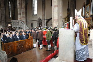 La celebrazione del Vescovo diocesano Karl Golser, iniziata alle 13 in punto, ha preso il via con un saluto in tre lingue: tedesco, italiano e ladino, a testimoniare la presenza di più gruppi in grado di convivere pacificatamente in un solo territorio come quello altoatesino. "Ringraziamo Silvius Magnago - ha sottolineato Monsignor Golser - che con le sue intuizioni politiche è riuscito a creare l'autonomia speciale di cui gode la nostra terra. Per quasi 50 anni Magnago è stato al centro della scena politica altoatesina, ed è stato il padre del Pacchetto di autonomia che ha permesso la pacifica convivenza tra i gruppi linguistici. Con le sue azioni politiche, ha fatto sì che l'Alto Adige diventasse una terra con una forte stabilità economica e sociale, e di tutto questo dobbiamo essergliene grati". Nella sua omelia bilingue, il Vescovo diocesano ha posto l'accento sul rapporto tra Magnago e la Chiesa: "Diamo l'estremo saluto a un cristiano sincero, che ha sempre avuto a cuore la Chiesa e i suoi fedeli, rispettando e sostenendo l'autorità ecclesiastica". Inoltre, Monsignor Golser ha voluto ricordare anche la companga di vita del Presidente emerito della Provincia, ovvero la moglie Sophia, definita "il suo angelo".