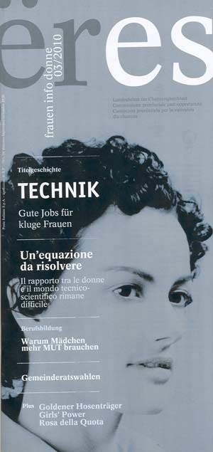 Fresco di stampa è il nuovo numero di "eres – Fraueninfodonne"; argomento principale il rapporto fra donne e tecnica e le opportunità lavorative per le donne nel campo tecnico-scientifico. Accanto ad un'intervista all'assessore provinciale competente per le pari opportunità, viene proposta un'analisi al femminile degli esiti delle recenti elezioni comunali.