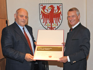 Per la seconda volta, dopo il 2008, la Giunta provinciale ha assegnato il Grande ordine di merito, la massima onorificienza istituzionale a livello locale. Il riconoscimento è stato attribuito a 12 personalità non residenti in Alto Adige che nei rispettivi ambiti di lavoro – dalla politica alla cultura, dall'arte all'amministrazione – hanno contribuito allo sviluppo della nostra terra. La cerimonia ufficiale, svoltasi il 5 settembre a Castel Tirolo, ha avuto un'appendice quest'oggi (3 novembre) a Palazzo Widmann: il presidente Luis Durnwalder, accompagnato dal vicepresidente Hans Berger, e dagli assessori Sabina Kasslatter Mur, Michl Laimer e Roberto Bizzo, ha infatti consegnato il Grande ordine di merito all'ex direttore della Bayerischen Rundfunk (BR), Thomas Gruber. "La nostra autonomia – ha spiegato il presidente Luis Durnwalder – è frutto del grande lavoro di molte personalità di alto profilo. I padri dell'autonomia si trovano in Alto Adige, ma anche in Austria, in Germania e nelle forze democratiche italiane. Li vogliamo ringraziare con questa onorificenza. Non si tratta solo di una medaglia, è molto di più: è il simbolico grazie di tutta la popolazione locale".
