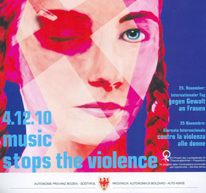 Il problema della violenza maschile nei confronti delle donne è assai attuale anche in Alto Adige. Per la ricorrenza della Giornata internazionale contro la violenza alle donne, 25 novembre 2010, al fine di sensibilizzare e coinvolgere le generazioni più giovani verso le tematiche della prevenzione della violenza contro le donne il gruppo di lavoro “Donna e violenza” della Commissione provinciale per le pari opportunità ha contattato otto bands giovanili locali proponendo loro di realizzare dei pezzi sulla tematica. L'iniziativa dal titolo "music stops the violence" ha portato, quindi alla registrazione in studio dei pezzi che sono stati caricati su una chiavetta musicale USB ed alla pubblicazione dei brani in un booklet che correda lo stick.
