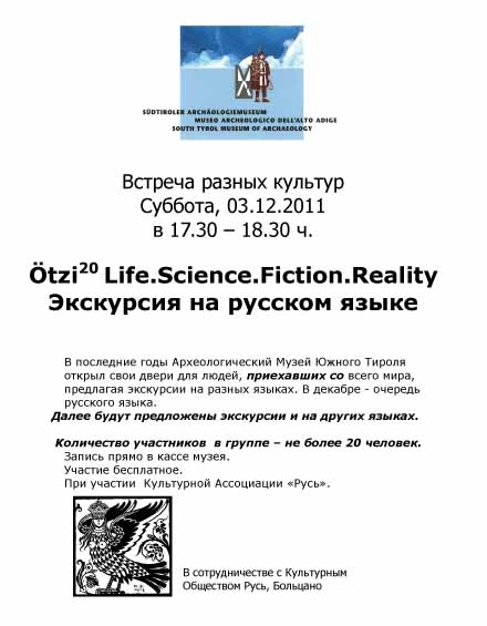 Sabato prossimo, 3 dicembre 2011, alle ore 17.30, sarà proposta una visita guidata gratuita in lingua russa (durata: 60 minuti) per illustrare la mostra temporanea Ötzi20 a tutti coloro che parlano, o comprendono, questa lingua.