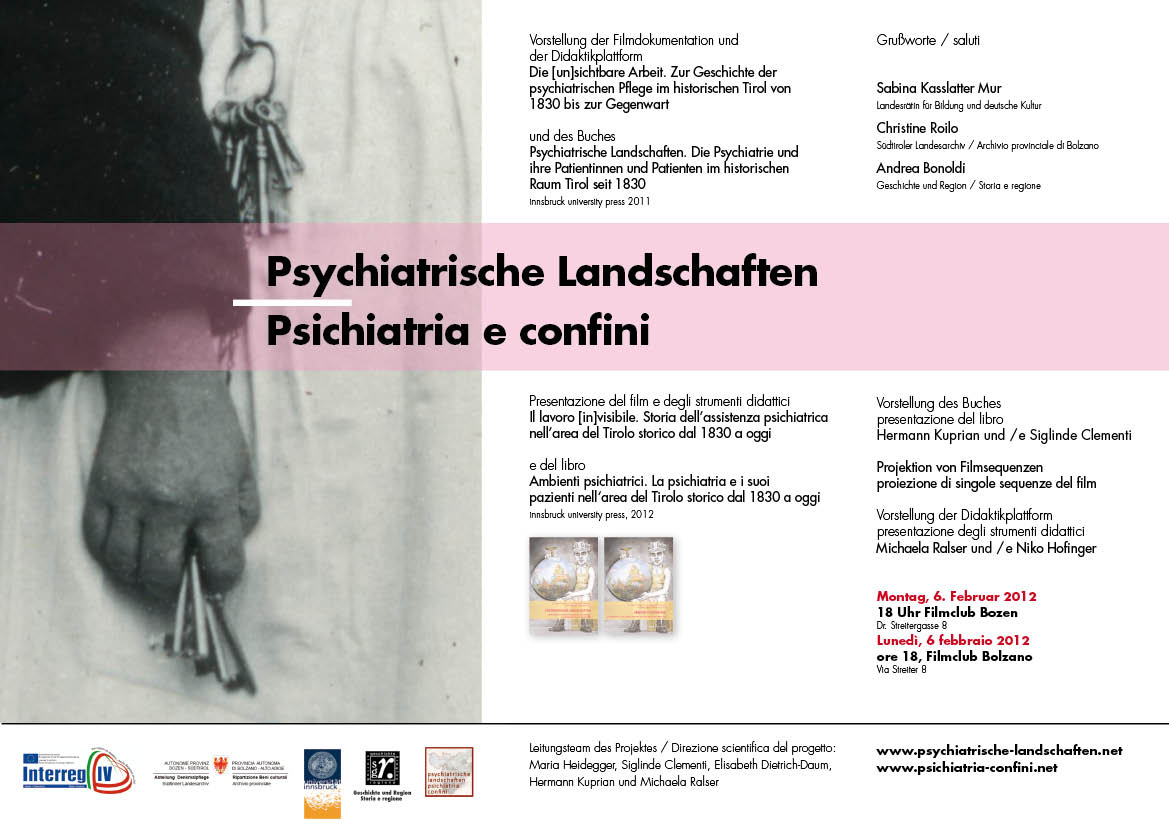 Il progetto Interreg “Psichiatria e confini” si è posto l'obiettivo di infrangere il tabu malattia psichica mostrando che la sofferenza e la storia di malati psichici non è la storia degli altri, è la nostra storia, quella dei nostri parenti, dei nostri amici. sono stati così prodotti il libro "Ambienti psichiatrici. La psichiatria e i suoi pazienti nell’area del Tirolo storico dal 1830 a oggi" (innsbruck university press, 2012) ed il film con strumenti didattici "Il lavoro [in]visibile. Storia dell’assistenza psichiatrica nell’area del Tirolo storico dal 1830 a oggi".
