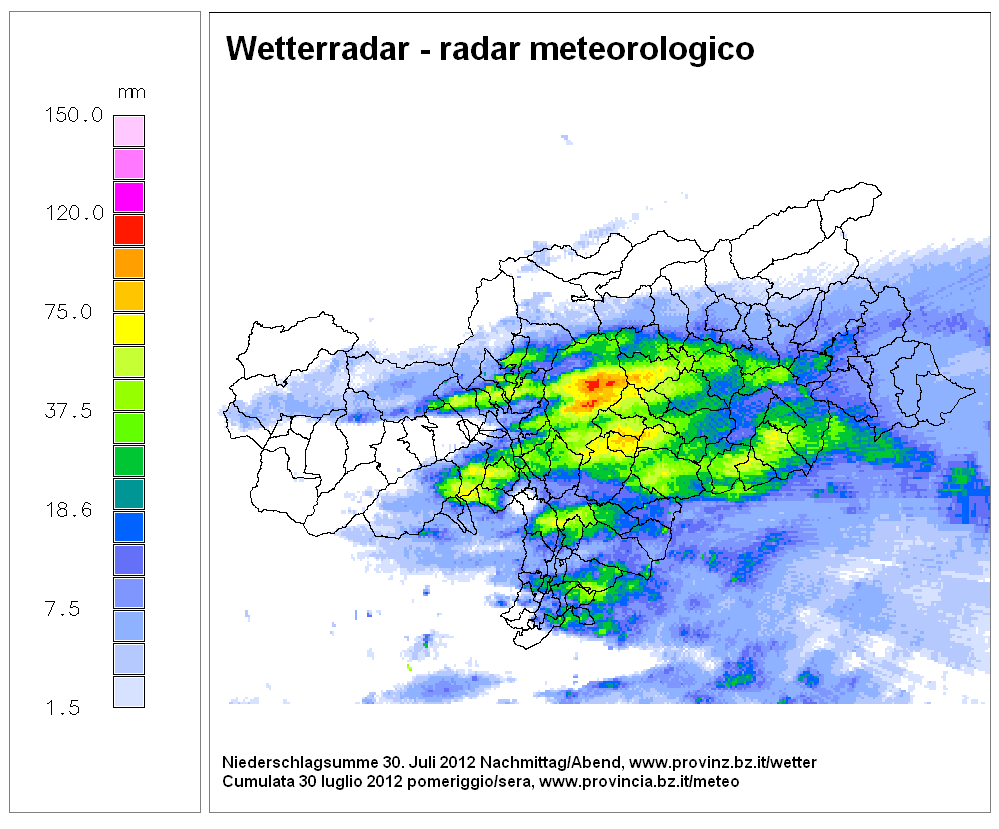 Per contro, i cinque Comuni con meno precipitazioni a luglio si registrano in val Venosta (Tubre, Lasa, Silandro Naturno e Malles) con livelli tra 63 e 84 mm. A Bolzano sono caduti 86 mm di pioggia, circa il 10% in meno della media dei mesi di luglio. Quello del 2012 si è contraddistinto per i molti temporali, solo in 8 giorni su 31 non si è registrato l'acquazzone. Il Servizio meteo provinciale segnala inoltre 22.200 fulmini, circa il 60% in più rispetto a luglio 2011. Solo ieri si sono registrate 2800 scariche elettriche soprattutto tra val d'Isarco, val Sarentina e e area dolomitica.