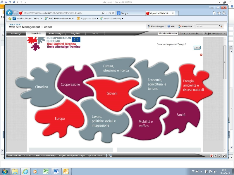 "Con un solo click - ha aggiunto il responsabile di progetto Matthias Fink - si possono raggiungere numerose informazioni su tutti i temi chiave dell'Euregio". Le 10 caselle del puzzle sono le seguenti: cittadino, cooperazione, cultura, istruzione e ricerca, economia, agricoltura e turismo, energia, ambiente e risorse naturali, sanità, mobilità e traffico, lavoro, politiche sociali e integrazione, Europa. Oltre alla storia, agli obiettivi e alle diverse forme di collaborazione fra le tre regioni alpine, il portale offre agli utenti tutte le informazioni e le ultime novità sull'Euregio: dai progetti a manifestazioni ed eventi, dalle pubblicazioni ai documenti ufficiali.