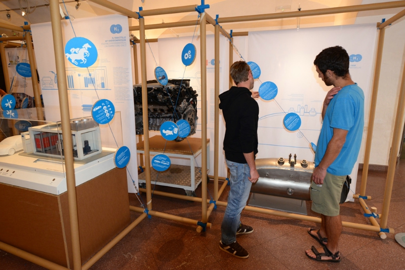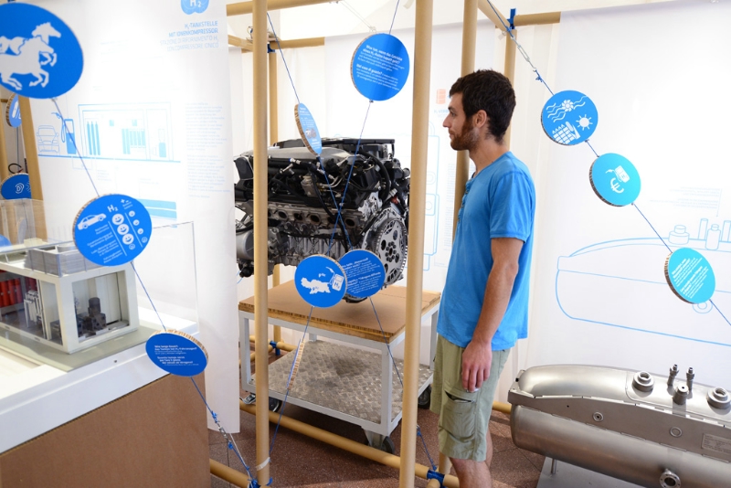 Attraverso grafiche, animazioni, modelli e oggetti - ad esempio celle a combustibile, bottiglie di stoccaggio e addirittura un ultraleggero a idrogeno - l'esposizione illustra, in maniera comprensibile, i diversi processi e cicli della tecnologia dell'idrogeno, mostrando quali soluzioni tecniche siano già applicabili e quali siano i vantaggi e gli svantaggi rispetto alla combustione convenzionale.