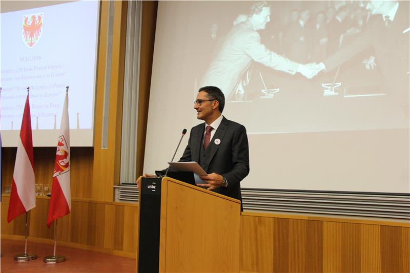 “Per la nostra terra l’Europa è una visione, una prospettiva e un’opportunità”. Questo il messaggio lanciato dal presidente della Giunta provinciale, Arno Kompatscher, nell’intervento di apertura dell’atteso convegno dedicato ai 70 anni dell’Accordo Degasperi-Gruber nell’aula magna dell’Università di Bolzano. “Noi vogliamo sviluppare con successo la nostra autonomia e ragionare su quale dovrà essere in futuro la strada che dovranno percorrere l'Alto Adige e l'Euregio”, ha sottolineato il Landeshauptmann. “Dopo il convegno del 5 settembre a Castel Firmiano che ha analizzato gli aspetti storici - ha aggiunto il presidente - oggi (18 novembre) il focus è sugli aspetti giuridici dell’Accordo di Parigi, sulla protezione delle minoranze in Italia e in Europa, sulla funzione di potenza tutrice dell’Austria e sul significato dell’Euregio. Per questo sono molto felice che partecipi al convegno anche il presidente della Commissione europea, Jean Claude Juncker”. Tra gli oltre 600 partecipanti al convegno, il presidente della Giunta ha salutato il vescovo Ivo Muser, i presidenti Ugo Rossi (Trentino) e Günther Platter (Tirolo), l’ex presidente Luis Durnwalder, il presidente dell’Università, Konrad Bergmeister, il vicerettore dell’Università di Innsbruck, Bernhard Fügenschuh, gli assessori della giunta provinciale, i consiglieri provinciali, l’europarlamentare Herbert Dorfmann, il presidente della Sottocommissione per l’Alto Adige del Parlamento austriaco, Hermann Gahr, il console austriaco, Wolfgang Spadinger il sindaco di Bolzano, Renzo Caramaschi e i numerosi sindaci presenti, i parlamentari ed ex parlamentari e i rappresentanti del mondo della cultura e della ricerca scientifica. Un saluto particolare Kompatscher, infine, lo ha rivolto agli studenti „che costruiranno il futuro della nostra terra“.