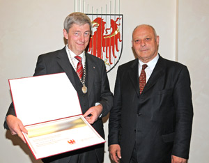 (LPA) Reinhard Olt, Südtirolexperte der renommierten "Frankfurter Allgemeine Zeitung" (FAZ), hat heute (30. Oktober) aus den Händen von Landeshauptmann Luis Durnwalder den Verdienstorden des Landes Südtirol entgegennehmen können. Olt hatte an der offiziellen Ordensverleihung am 5. September auf Schloss Tirol nicht teilnehmen können.