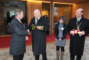 Landeshauptmann Durnwalder übergab Umweltlandesrat Laimer und Naturparkhausleiterin Andrea Leitner symbolisch den Schlüssel für das neue Naturparkhaus, das nun als Besucherzentrum Dreh- und Angelpunkt der Bildungsarbeit im 10.196 Hektar Fläche umfassenden Naturpark Puez-Geisler ist. Bürgermeister Messner überreichte die Benutzungsgenehmigung. Nun hält das Naturparkhaus seine Tore bis zum 31. März für Besucher geöffnet. Am 17. April werde um 17 Uhr die offizielle Eröffnungsfeier stattfinden, kündigte Bürgermeister Messner an.