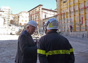 Seinen mittlerweile dritten Besuch im Erdbebengebiet hat der Landeshauptmann auch genutzt, um weitere vom Kiener Fertighaushersteller Rubner errichtete erdbebensichere Holzbauten unter die Lupe zu nehmen, darunter einen Kindergarten in Pizzoli, provisorische Wohnhäuser in Arischia sowie ein Schülerheim und einen Kinderhort in Coppito. Letzterer gilt als Vorzeigemodell, wird er doch über Solaranlagen und die Geothermie mit Energie versorgt und derzeit von der KlimaHaus-Agentur als KlimaHaus A zertifiziert. Auch der so genannten roten Zone, dem immer noch einsturzgefährdeten und daher gesperrten Zentrum von L'Aquila, hat Durnwalder einen Besuch abgestattet.