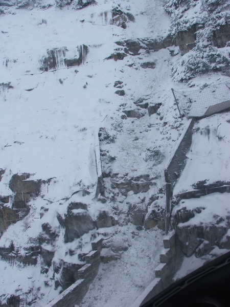 Die Landesgeologen waren gestern gegen 14.00 Uhr verständigt worden. Da es jedoch aufgrund der Witterungsverhältnisse unmöglich war, das Gelände weder zu Fuß zu erreichen noch einen Erkundungsflug durchzuführen, wurde die Straße vorsichtshalber gesperrt. Heute um 8.00 Uhr hat sich die Geologin Maria Schmid bei einem Hubschrauberflug vor Ort ein Bild der Situation verschafft; anschließend wurde verfügt, dass die Straße wieder für den Verkehr geöffnet werden kann.