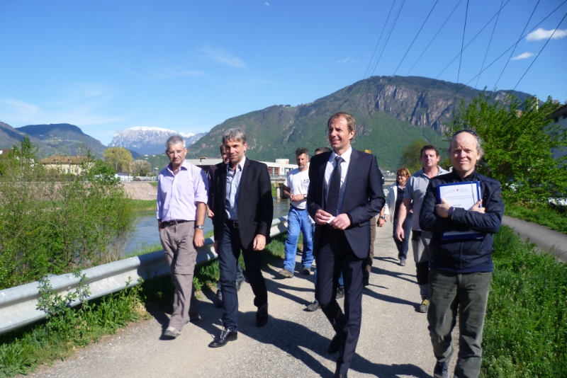 LPA - Am Hochwasserstützpunkt in Sigmundskron und an der Baustelle am Eisack im Süden Bozens hat sich Landesrat Schuler gestern (9. April) bei einem Lokalaugenschein mit Gemeindevertretern und Technikern ein Bild von der Lage der Bauarbeiten verschafft, die derzeit durchgeführt werden.