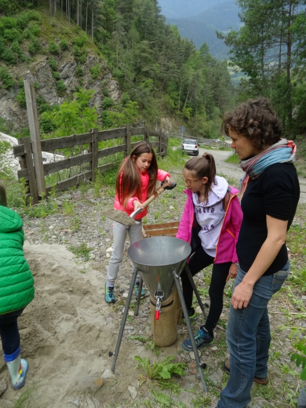 Dann wurde die Theorie in die Praxis umgesetzt: Mit Landschaftsarchitektin Marion Aschbacher und Gewässerokologen Peter Hecher von der Landesabteilung Wasserschutzbauten wurde an einem kleinen Wasserlauf neben dem Afererbach im Rückhaltbecken oberhalb des Dorfes Albeins die Erstellung eines Gefahrenzonenplanes erprobt. Die Schülerinnen und Schüler errichteten eine kleine Siedlung aus selbst gebastelten Häusern am Bach und erzeugten ein künstliches Hochwasser. Sie erstellten einen Gefahrenzonenplan und schätzten das Risiko ab, indem sie rote, blaue und gelbe Zonen einzeichneten. Ziel des Schulprojektes, erklärt Landschaftsarchitektin Aschbacher, war es, die Schülerinnen und Schüler mit dem Thema Naturgefahren vertraut zu machen und spielerisch den Gefahrenzonenplan zu veranschaulichen. Dabei, betont die Expertin, war es wichtig, den Bach nicht als gefährlich und bedrohlich darzustellen, sondern den Kindern auch zu vermitteln, wie viel Spaß es bereitet, am Bach zu bauen und zu spielen. Im Umgang mit der Natur ist jedoch Respekt wichtig, der richtige Umgang mit Naturgefahren ist grundlegend, um in Einklang mit der Natur leben zu können.