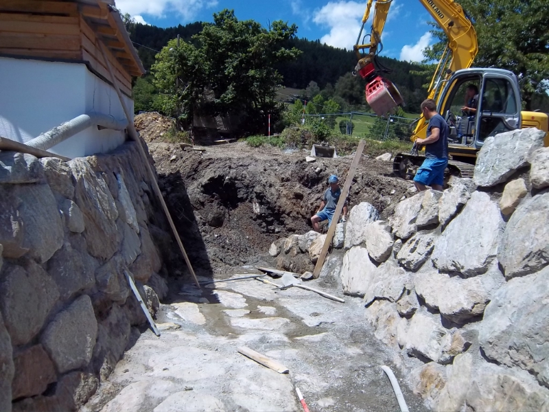 Im Bereich der Häuser wird eine Künette aus kleinen Zyklopensteinen und Beton errichtet, um größere Wassermengen schadlos abführen zu können. Wo es der Platz erlaubt, fällt das Bachbett auch ein wenig breiter und flacher aus und wird mit Trockenmauerwerk befestigt. Zusätzlich ersetzen Vorarbeiter Hubert Rungger und seine Arbeiter drei Rohrdurchlässe durch Brücken. "Mit dieser Maßnahme erhöhen wir die Durchflusskapazität", erklärt Bauleiter Paul von Hepperger. Im Zuge der Arbeiten werden auch Kabel und Abwasserleitungen neu verlegt. Für die Ausarbeitung des Projekts zeichnen die Freiberufler Michael Pfeifer und Florian Knollseisen verantwortlich.