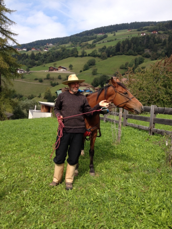 Bei seiner 700 Kilometer langen Reitwanderung durch das Dolomiten-UNESCO-Welterbegebiet machten der Grödner Rudolf Nocker und seine Stute "Soraya" kürzlich in Villnöss halt. Hier ging es um die nachhaltige Mobilität.