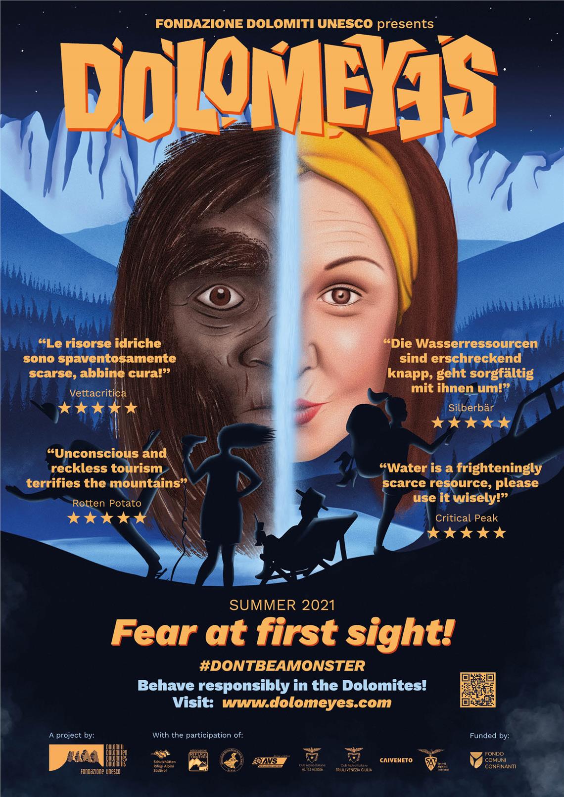 Respektlose oder unsensible Verhaltensweisen fürchten und folglich vermeiden: Die Liebe auf den ersten Blick zu den Bergen wird zur "Angst auf den ersten Blick!". So entstand die Figur Dolomeyes (wörtlich "Die Augen der Dolomiten"), ein furchterregendes Wesen, das zwischen den Felsen und dem Schnee der Dolomiten lebt und auch die höchsten Gipfel gegenüber respektlosen Verhaltensweisen verteidigt. "Das Monsterhafte ist Teil des Menschen, am Berg wie anderswo", unterstreicht der Autor der Kampagne, der Regisseur Cristiano Perricone von BrodoStudio (Udine). "Der Ton der Kampagne erinnert an einen parodistischen Stil, der mit der leichten und nostalgischen Bildsprache von B-Movies des Horrorgenres aus den 1980er Jahren verbunden ist."