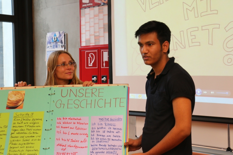 Stephanie Risse vom Kompetenzzentrum Sprachen der Freien Universität Bozen verwies auf die sehr gezielte Sprachförderung, die das Projekt auszeichnet. Es ginge dabei in erster Linie darum, die Balance zwischen Inklusion und individueller Sprachförderung zu finden. Es wurde ein eigenes Lehrerteam für "Deutsch als Zweitsprache" gebildet, das den Schülern in den ersten Monaten ihrer Schulzeit bis zu zwei Jahren eine gezielte Deutschförderung bietet. Der Deutschunterricht erfolgt in kleinen Gruppen, was eine gezielte und individuelle Förderung ermöglicht. Darauf aufbauend kann dann möglichst rasch die Integration der Jugendlichen mit Migrationshintergrund in den Regelunterricht erfolgen.