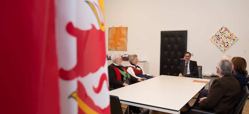 Eine Delegation des Verbandes der Südtiroler in Österreich unter der Leitung von Präsident Helmuth Angermann hat am heutigen Mittwoch (11. März) Landeshauptmann Arno Kompatscher und Landesrätin Martha Stocker getroffen. Dabei wurde dem Landeshauptmann das Ehrenprotektorat des Vereins übergeben.