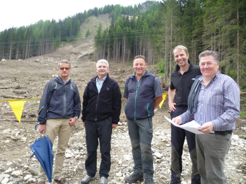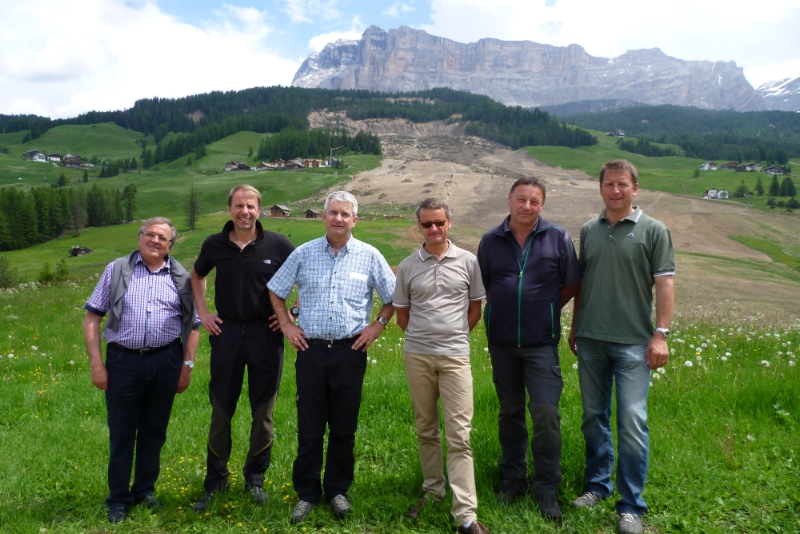 Am Beginn stand der Besuch der Baustelle bei der Rutschung Crëp dl Sela in der Gemeinde Corvara: Schneeschmelze, Sättigung des Bodens und Regen vom 27. bis 29. April 2014 haben unter der Liftanlage "Borest" bei Corvara einen Hang in Bewegung gesetzt. Die Mure hat sich über zwei Wege zu Tal bewegt und ein Hotel, einige Reihenhäuser sowie das Militärareal "Villaggio alpino" bedroht. Um den Ort künftig vor dieser Gefahr zu schützen, hat das Amt für Wildbach- und Lawinenverbauung Ost der Landesabteilung Wasserschutzbauten einen Ablenkdamm oberhalb der Liftanlage errichtet und das Gelände modelliert, um eine eventuelle Rutschung in eine vorgegebene Richtung zu lenken, einen Ablauf für Regenwasser direkt bis zur Gader mit Unterquerung unterhalb der Staatsstraße verwirklicht sowie Drainagen und Abzugsgräben zur Stabilisierung der abgelagerten Rutschungsmasse angelegt. Geplant ist noch die Errichtung eines Ablagerungsbeckens, in dem abrutschendes Material aufgefangen werden soll. Die Finanzierung erfolgt über den Zivilschutz. Die Kosten liegen bei 400.000 Euro. Für Projekt und Bauleitung zeichnet Amtsdirektor Sandro Gius verantwortlich, für die Ausführung Vorarbeiter Markus Passler mit seinem Bautrupp.