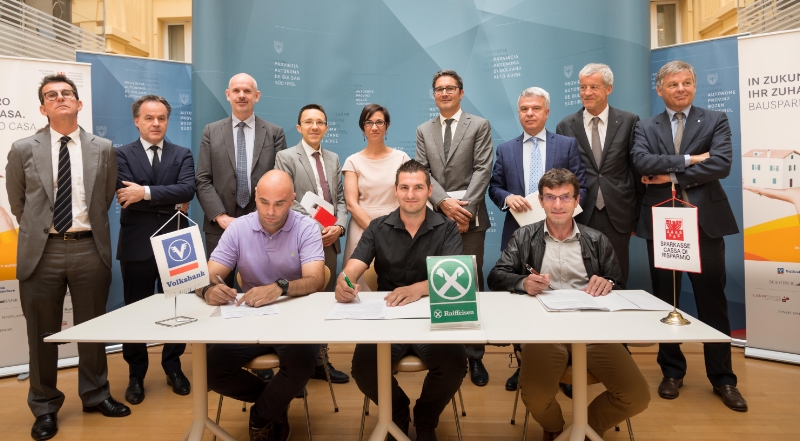 Das Südtiroler Bausparmodell ist Wirklichkeit: Ab sofort können Bürger, die in einen Zusatzrentenfonds eingeschrieben sind, die neue Fördermöglichkeit in Anspruch nehmen und ein Darlehen zu einem günstigen Zinssatz von 1,5 Prozent aufnehmen. Heute (29. Juni) waren Landeshauptmann Arno Kompatscher und Wohnbaulandesrat Christian Tommasini dabei, als die ersten Verträge unterzeichnet worden sind.