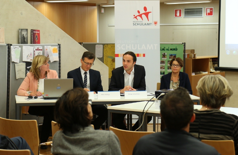 Bildungslandesrat Philipp Achammer, Schulamtsleiter Peter Höllrigl, Schulinspektorin Eva Maria Brunnbauer sowie Vertreter der Partnerorganisationen und Schüler, die bereits ein Praktikum absolvieren konnten, haben die Initiative heute in der Bibliothek des Realgymnasiums und der Fachoberschule für Bauwesen in Bozen vorgestellt.