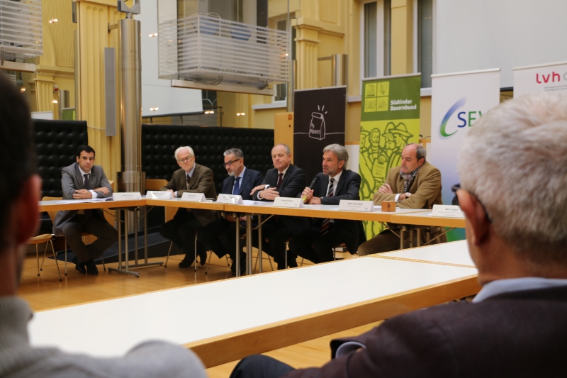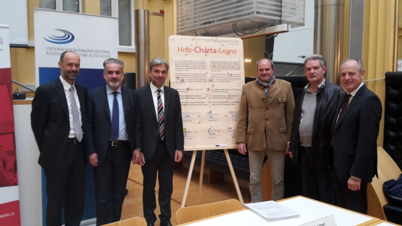 Mit dem Präsidenten des TIS innovation park Nikolaus Tribus, Bauernbund-Direktor Leo Tiefenthaler, Paolo Bortolotti von der Sektion Holz im Südtiroler Unternehmerverband, Kurt Egger von der Berufsgruppe Holz im Wirtschaftsverband Handwerk und Dienstleister, Rudi Rienzner vom Südtiroler Energieverband und Hansjörg Prast von IDM Südtirol - Alto Adige hat Landesrat Arnold Schuler heute die Holz-Charta aus Sarntaler Zirbenholz unterzeichnet, deren Ziel die Stärkung der Wertschöpfung im gesamten Holzsektor ist. Moderiert wurde die Veranstaltung von Paolo Bertoni vom Cluster Holz & Technik im TIS innovation park, wo derzeit auch die Fäden des Holz-Tisches zusammenlaufen.