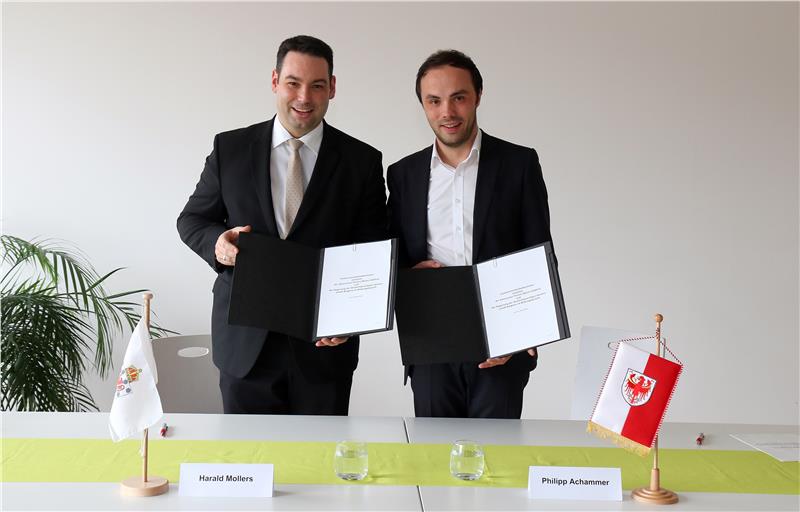 Minister Harald Mollers und Landesrat Philipp Achammer haben heute das Zusammenarbeitsabkommen im Bildungsbereich unterzeichnet. Foto: LPA/Ingo Dejaco