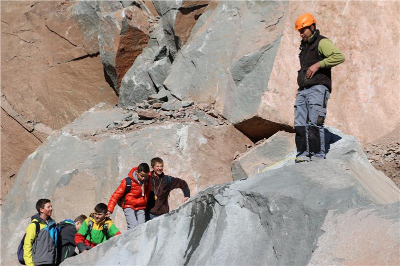 Gespannt betritt die Klasse 2D den Steinbruch, lauscht den Ausführungen des Sprengmeisters, stopft unter Anleitung Sprengstoff in den Felsen, sieht der Detonation aus sicherer Entfernung zu. Erfährt nebenbei, dass die Erdkruste nur 40 Kilometer dick ist und verlässt den Steinbruch mit viel neuem Wissen und einem Stück Erdkruste in der Tasche.