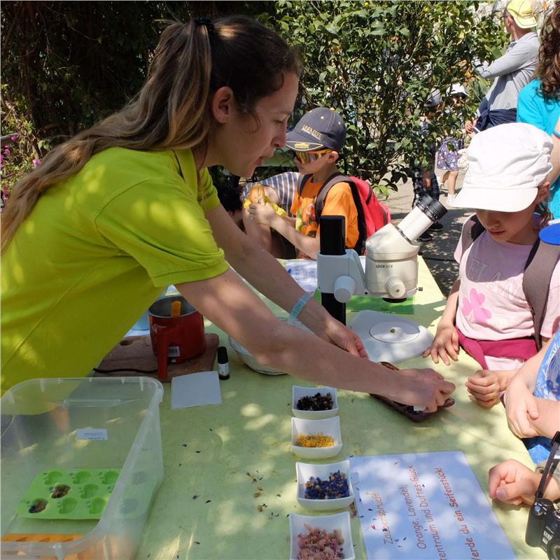 Bei verschiedenen Workshops standen Düfte und Farben in der Pflanzenwelt im Mittelpunkt. Der Frühlings-Aktionstag in den Gärten von Schloss Trauttmansdorff bot ein vielfältiges Programm: Verkostung exotischer Früchte und Tees, Mahlen von Kakao, Herstellung von Duftcremes, Basteln eines großen Mosaiks aus Hülsenfrüchten.