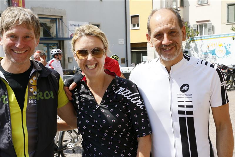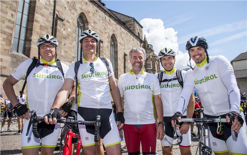 "An den Grenzübergängen", wies Landeshauptmann Arno Kompatscher auf die Botschaft der Radtour hin, "gab es keine Probleme; die Radtour ist Ausdruck dafür, wie die Gemeinschaft verschiedener Länder er-fahren und gelebt werden kann". Er zeigte sich überzeugt, dass dieses einmalige Erlebnis wiederholt werden sollte. Er selbst sei kein Radrennfahrer, erklärte er, wohl aber unternehme er öfters Mountainbike-Runden im Schlerngebiet. Als Proviant für seine Teilnahme an der Etappe Bozen-Meran-Bozen führe er Völser Wasser mit, antwortete er auf Anfragen der zahlreichen Medienvertreter, und ansonsten gedenke er, sich an Südtiroler Spezialitäten zu stärken. Mit dabei im Südtirol-Team heute neben anderen Kompatscher Kabinettschef Dominik Holzer und der Direktor der Wirtschaftsabteilung Hansi Felder, Skirennläufer Peter Fill und Biathletin Karin Oberhofer. Von seiner Stadt bereits im Rad angefahren kam Bürgermeister Paul Rösch, "der erste Südtiroler Triathlet in Hawaii". Am Pfarrplatz traf er auf seinen neuen Amtskollegen, Bozens Bürgermeister Renzo Caramaschi, der wegen dringender Amtsgeschäfte nicht mitradeln konnte.