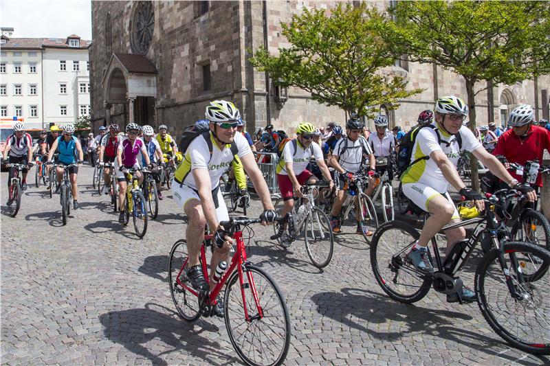 200 Radlerinnen und Radler zwischen 23 und 79 Jahren aus Bayern Tirol, Südtirol und dem Trentino sind heute von Brixen kommend auf dem Pfarrplatz in Bozen zusammengetroffen und etwa eine Stunde später nach Meran aufgebrochen; der Anteil der Frauen liegt bei 35 Prozent. Die Euregio-Alpen-Radtour begann am 29. Mai am Chiemsee und endet nach 500 Kilometern und sieben Tagen am Gardasee. Begleitet wird die Tour vom Bayerischen und Österreichischen Rundfunk. Das Motto, hieß es, sei "tagsüber radeln, abends feiern".
