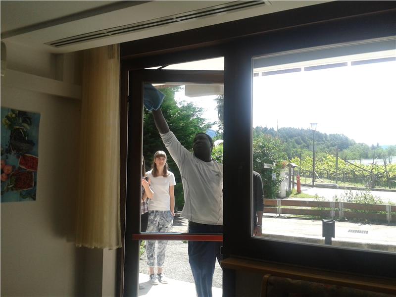 John aus Nigeria, von Beruf Koch, schneidet den Kohlkopf in hauchdünne Streifen. Anita und Lea waschen grünen Salat. Desmond aus Ghana bereitet den Teig für sein Fladenbrot vor. Julia mixt Spinat. Eric und Happy rühren eifrig den Spätzleteig, Sophie beobachtet die beiden aufmerksam und gibt Anweisungen auf Englisch.